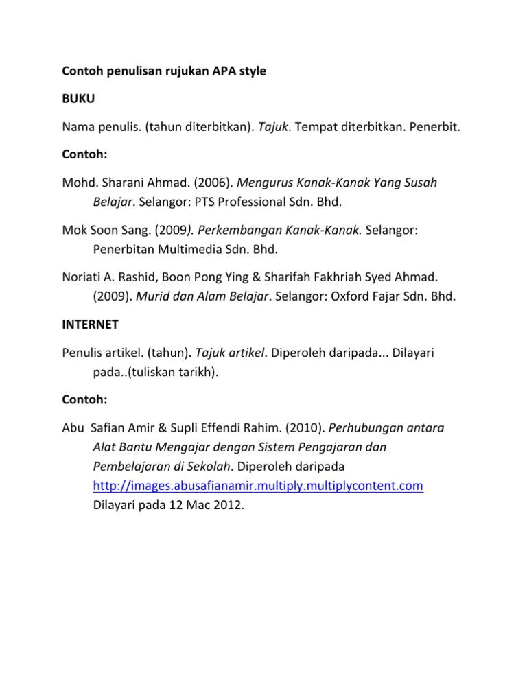 Dewan Bahasa dan Pustaka. Sebagaimana sistem Harvard menulis nota rujukan gaya APA juga mengambil kira sumber rujukan atau bahan samada buku jurnal tesis laman Web dan sebagainya. BUKU Abdullah Hassan 2009.